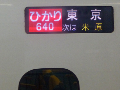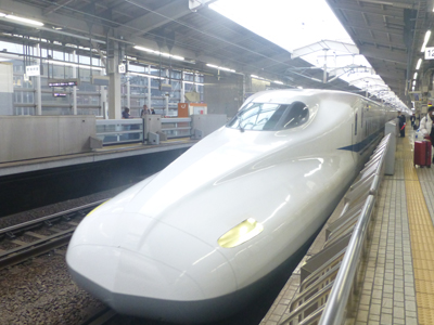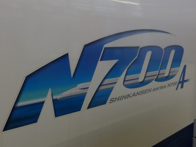 東海道新幹線の主力N700Sの一世代前のN700A。側面ロゴをよく見ると新幹線が描かれている。 |