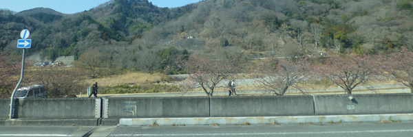 車内。下 大仁付近で、車道の向こう側の人が写っている道が「長嶋茂雄ランニングロード」。1967〜74年のオフシーズンに、長嶋茂雄が自主トレーニングで走っていた道。 |