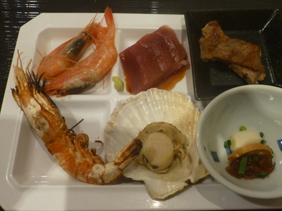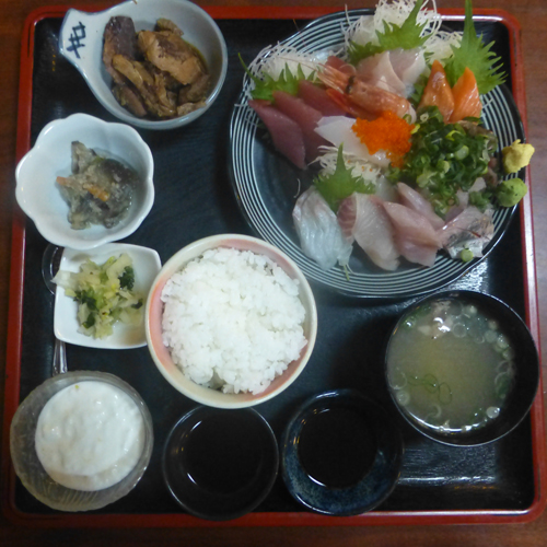 刺身定食。刺身の量が半端なく多い。9種類で、えび以外は2、3切れ。全部で20切れ少々。 満腹になった。 |
