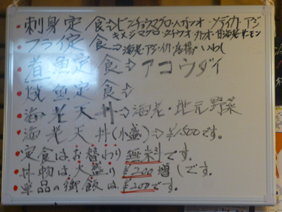 ホワイトボードには刺身の魚種が書かれていた。これで2500円とは安すぎ。 |