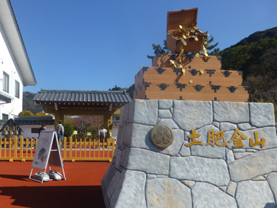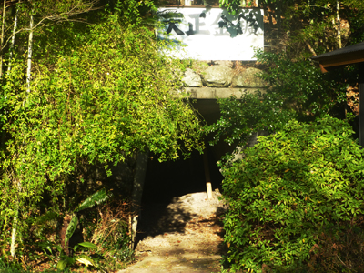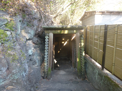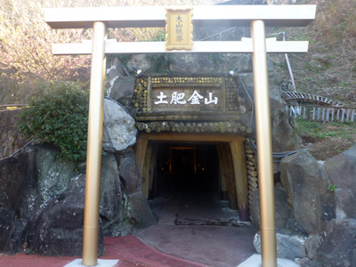 坑道の入口。金色の鳥居があるのは、金鉱の安全を祈る「山神社」が坑道内にあるため。 |