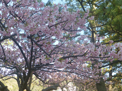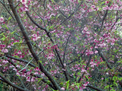 敷地内では早咲き桜が満開。河津桜と同じ品種だろうが、ここでは土肥桜というようだ。 |