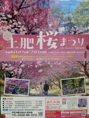 つぎに清雲寺へ。入口付近に、「土肥桜まつり」のポスターがあった。写真は、この寺で撮影したようだ。1月17日から2月11日と、すでに終わっている。そんなに早いのかとびっくり。河津桜よりも早いんだ。 |