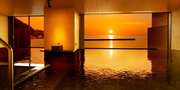 山側だが、わずかに海岸も見えた。下 (土肥マリンホテルのHPより拝借) 浴場は大きく、海水面と連続して湯舟が見えるように工夫されていた。露天風呂が工事中のためか、入れなかった。 |