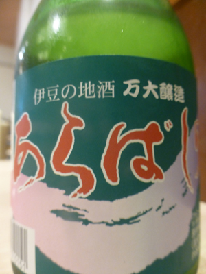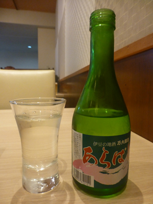 夕食会場へ。下左 アルコール飲料は有料。地酒「あらばし」を飲む。 下右 製造は伊豆市の万大醸造。伊豆市は広くて、伊豆市といっても、土肥ではなく修善寺の蔵。 |