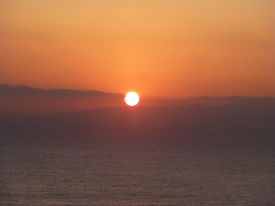 部屋から日の出がきれいに見えた。伊豆大島の上側に日が現れた。朝食は前日とほぼ同じなので、写真を省略。 |