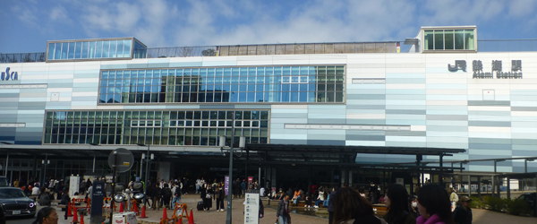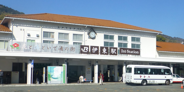 9時33分着の伊東で下車。荷物をコインロッカーに預け、街歩きに出る。下 伊東駅舎。たまたま、CMで有名なハトヤの送迎車が停車中。 |