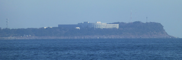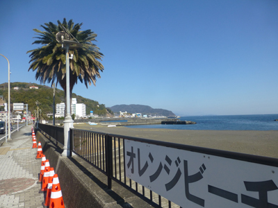 海岸に出る。オレンジビーチというようだ。下 初島が見える。大きな建物もあるようだ。 |