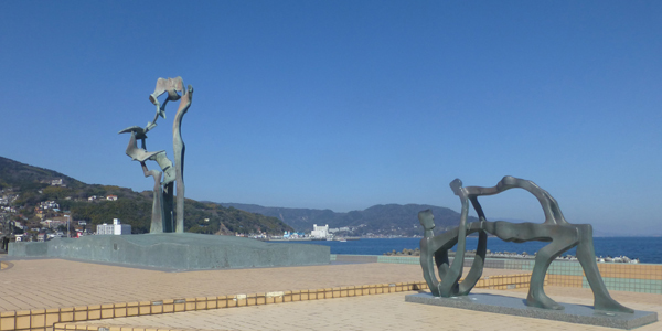 上 道の駅・マリンタウン。大きな道の駅で、土産物も少し買った。別のところで入浴予定なので入らないが、温泉もある。 左 青いポスト。速達用でない青いポストは初めて見た。 下 なぎさ公園。伊東市出身の彫刻家・重岡建治の彫刻がたくさん設置されている。 |