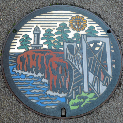 マンホール。城ヶ崎海岸が描かれている。今回は行かなかったが、行きたいところだ。 |