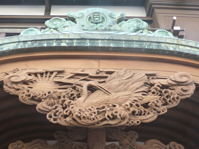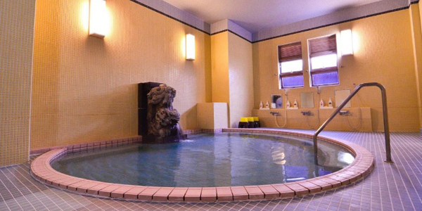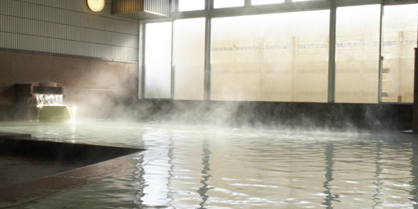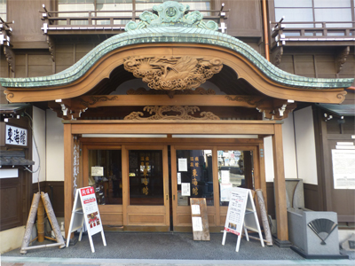 玄関上部のひさしの彫刻もとても細かいものだ。下 (伊東観光協会のHPより拝借) 大浴場。 ほかに小浴場があり、男女の入替時間の関係で、見学の前に入浴するように言われた。 |