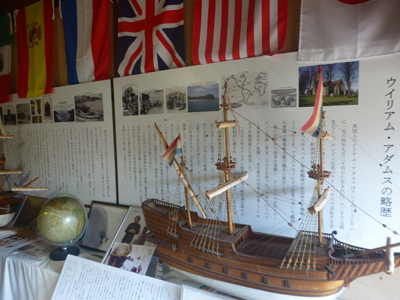 伊東にゆかりのある何人かの人物についての展示もあった。その1つ、ウィリアム・アダムス(三浦按針)の展示室。伊東では日本初の洋式帆船が彼の手によって建造されたという。 ほかに東郷平八郎などの展示室があった。 |