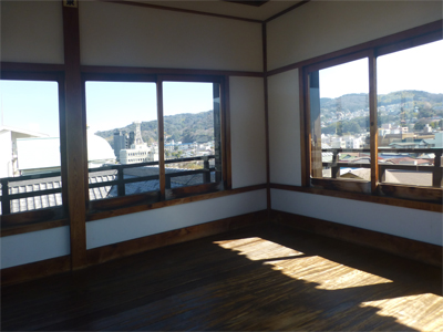 裏手から見た東海館。展望室はこちら側からしか見えなかった。東海館は、見学が予想外に充実していて、入浴、喫茶をあわせ2時間滞在。 |
