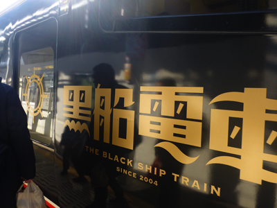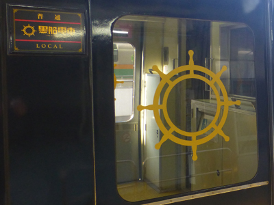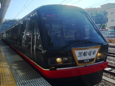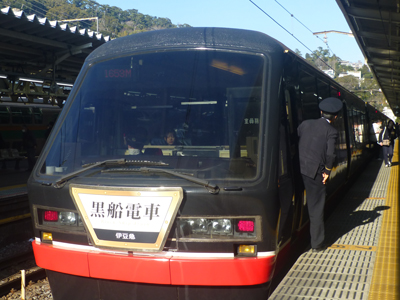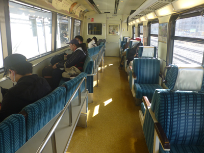 駅間で1両目の後半部を見に行った。海側が窓を正面に見るようになっているのはキンメ電車と同じ。座席は黒船柄ではなくて、普通の柄だった。 |