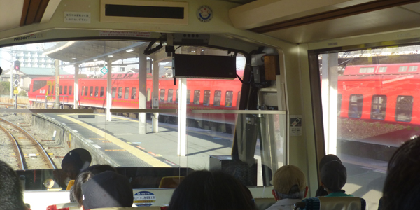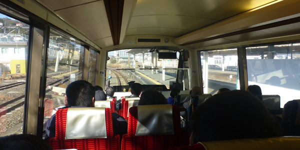 1両目の乗車口付近。下 最前席は埋まっていたので、空いていた一番後ろに着席。階段状になっているので、一番後ろでも眺望がいい。 |