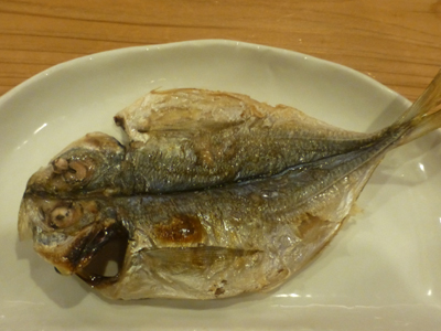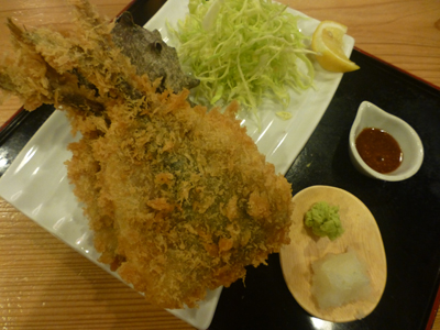 アジフライ。レアってメニューに書いてあったが、レアというほどのもレアさではなかった。ほどよく揚げられていて美味しかった。 |