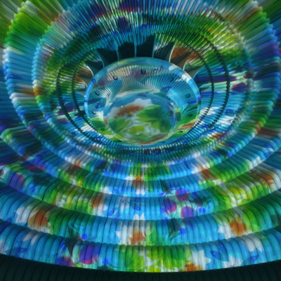 エスカレータの途中にホールがあり、プロジェクションマッピングで天井にさまざまなデザインが映し出されて変化する。これも見ていて楽しかった。 |