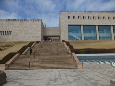 エスカレータの最終区間は、エスカレータで上るか、広場で建物や景色を見て階段を歩いて上るかを選べる。歩いて上がる方を選んだ。まず建物を、ここで初めて見る。すごい高所にある。 |