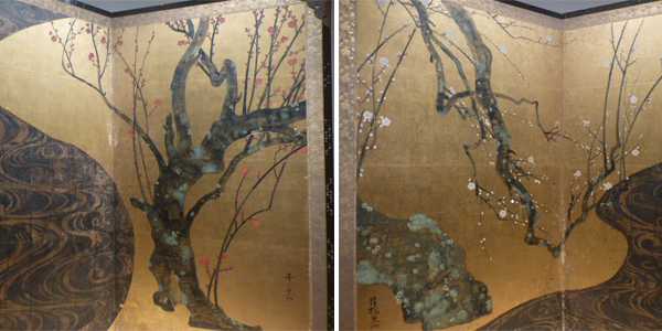 17世紀、野々村仁清作「色絵藤花文茶壷」。国宝。下 18世紀、尾形光琳「紅白梅図屏風」。国宝。 |