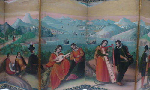 16世紀、「洋人奏楽図屏風」。日本人が描いたが、西洋画の技法で描かれている。 |