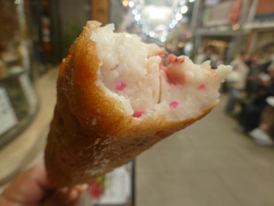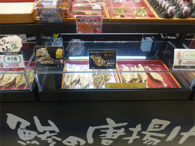 昼食は食べ歩きで行うことにした。まず、駅ビルの中で見つけたアジのから揚げ。アジのから揚げとは珍しい。 |