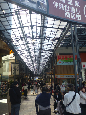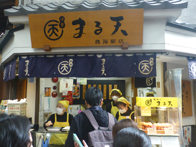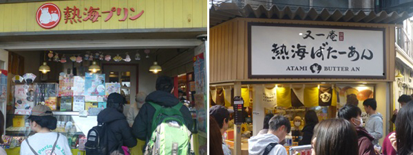 仲見世通り商店街のアーケードへ。下 アーケードを出た付近に、熱海プリンと熱海ばたーあんぱんの店があった。 どちらも長い行列で、このあとの予定を考えると並んでいる時間がなかったし、すでにかなりお腹がいっぱいになっているのでパスした。また熱海に来た時には、ぜひ試してみたい。 |