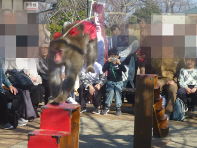 城入口そばの広場で猿回しをしていたので、見ていく。 |