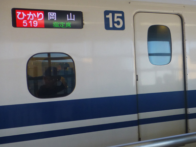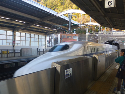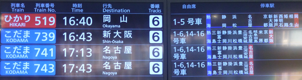 上 荷物をロッカーから出し、入場し、ホームに着くと、16時35分とぎりぎり。16時40分発ひかり岡山行き。静岡、浜松、名古屋のあと京都から各駅停車。 左 入線してきたひかり。 |