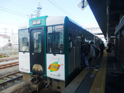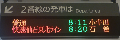 朝食(写真は省略)のあと、大急ぎで駅に向かい、8時11分発、小牛田行きに乗車。 |