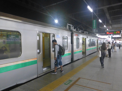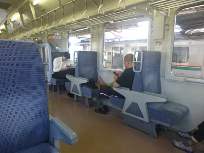 小牛田行き。ロングシート。小牛田着は定刻では8時58分だが、遅れが出て9時3分ごろとのこと。乗換える鳴子温泉行きが9時7分発なので、少々心配になる。 |