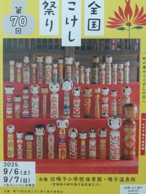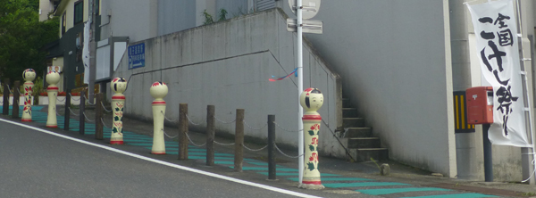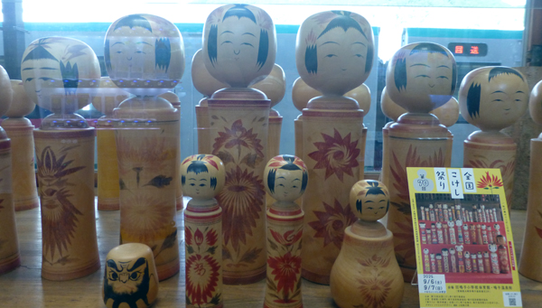 この日は、9月3日、水曜日。この週の週末の6。7日、土、日曜日に、全国こけし祭りが、旧鳴子小学校であるとのこと。また、別の情報源から、同じ日には温泉神社の例祭があり、全国こけし祭りは例祭にあわせたイベントで、こけしも参加したパレードが行われるとのこと。 下 駅構内でも、こけしがたくさん展示されている。こけしの後には、ガラス越しに下車したばかりの気動車が写っている。 |