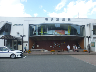 駅舎。出入口は左手のひさしのついているところ。鳴子温泉は初訪問で、温泉街の散策と日帰り湯を楽しむつもり。 |
