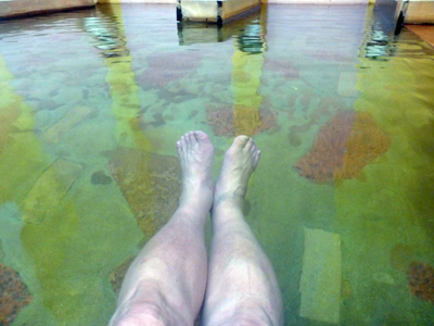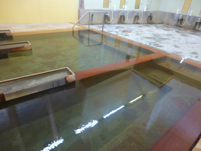 ほかの客はなく、湯を独り占めできた。手前の浴槽は、90cmの深さだった。先ほどの公衆浴場と違い、湯は透明で、適度な温度。 |