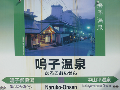 鳴子温泉駅の駅名標。写真は、夜の「滝の湯」のようだ。14時10分鳴子温泉発。15時31分小牛田着、15時33分小牛田発。16時19分仙台着。駅で土産物を見たりして、17時ごろ宿に戻った。 |