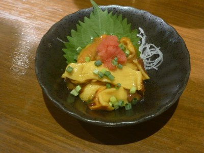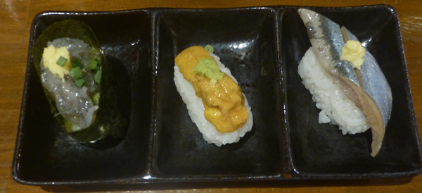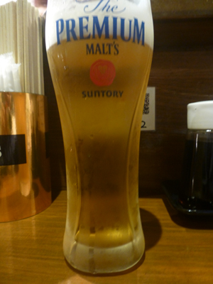 生ビール。下 突出しは、握りすし。しらす軍艦巻、うに、さんま。 ネット情報で、知っていたが、突然、握りが最初から出てきたら驚くだろうな。 |