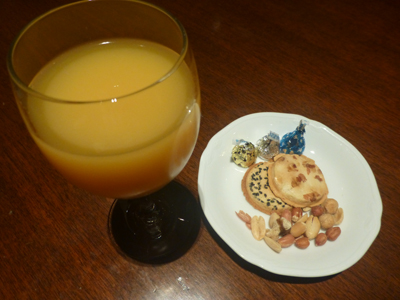 宿に戻り、ラウンジに行ってみた。すでに、カクテルタイムは終わっていたので、どんな様子かみたくて。飲物とわずかだは乾きものとチョコレートなどが出ていた。利用者はほとんどなく。がらがらであった。 |